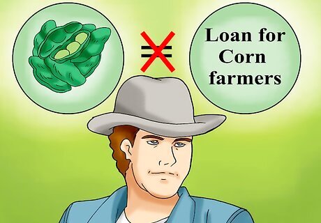 Identify loans that would meet your needs. Loans may be restricted to certain types of farming activities, or to certain phases of farm development. Some loans may only be available for beginning farms, while others are available for existing farms that have been in operation for several years. Some loans also may be restricted to specific regions. For example, federal-guaranteed loans may be available only to farmers in certain parts of the country, while loans insured or guaranteed by state governments or nonprofit organizations may be restricted to specific counties. Read the loan requirements carefully to make sure your farm qualifies for the loan offered. Some loans may have reporting requirements, similar to grants, that are designed to confirm you're using the proceeds of the loan for the purpose intended. Avoid applying for a loan that you don't need just because it is available. For example, if you intend to grow soybeans, don't apply for a loan for corn farmers. If the lender discovers that you are not a corn farmer, you may incur financial penalties as a result. Additionally, the government may bar you from applying for government loans or other financial assistance in the future if you falsify information related to your farm on your loan application.