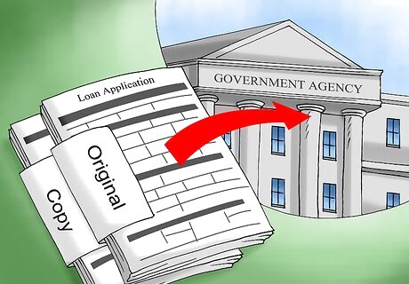 Submit your loan application. Once you've completed the application form for the loan, gather any documents that must accompany your application and make a copy of the entire package for your records before sending it to the appropriate government agency or lending institution. Typically government loans are serviced by a particular bank or lending institution in your area. This means your application paperwork should go there – not to the government agency that guarantees or insures the loan. The application should include an address to which the completed paperwork should be sent. If you're completing your application online, you may be able to submit it online as well. If you submit your application online, the bank or lending institution typically will provide you with an address where you can send any documents for which you don't have digital copies to attach and send electronically.