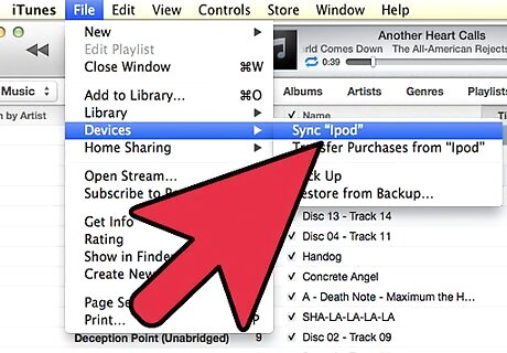 Plug in your iPod. The iPod should automatically begin to sync with your iTunes library unless you have changed the settings. Do not disconnect while it is syncing, otherwise some or all of the files may not be copied into your iPod.