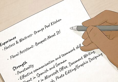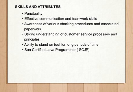 Highlight your skills. Include any skills that would be relevant to your employer. You might be a good listener, fluent in French, or familiar with Java programming. Skills can include certifications you have, your creative abilities, languages you speak, or software you know how to use. Mold your skillset to traits companies look for. Instead of "loves to read," for example, you could put "strong reading comprehension." Hobbies won't catch an employer's eye, but profitable skills will.