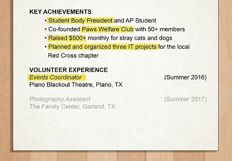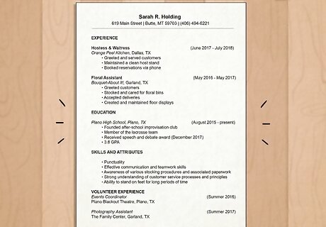 List your leadership experience. Once you've gained work experience, you can put your work history on your resume. For your first job, though, include information about any leadership positions you've held to show that you're committed and motivated. Maybe you were your school's class president, or maybe you volunteered as a summer camp counselor. Include the position title, when you accomplished it, and skills you learned from the experience. Even if you've never been officially employed, you can add part time work (like babysitting or yard work) or community service experiences. Never lie about experiences on your resume. Your potential employer will eventually find out, and this will most likely prevent you from getting the job (or keeping it if you already have it). Highlight what you have accomplished as honestly as possible.