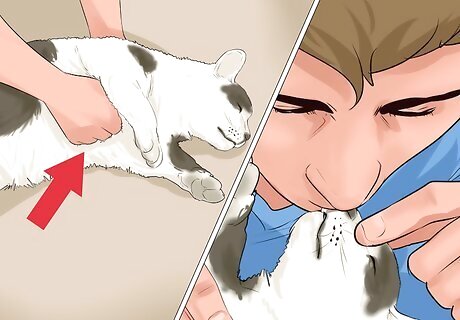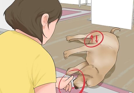 Examine your pet. With your pet removed from the electrical source, you will need to examine your pet. You can assess his breathing in a few different ways, such as watching for chest movements (chest moving up and down) and putting your hand in front of his nose to feel for his breath. You can also gently pluck a few hairs from his coat, hold them in front of his nose, and see if the hairs move. If the hairs move back and forth, your pet is breathing. Check your pet’s pulse by placing your finger on the inside of his middle thigh. This may be challenging if you have a small animal, such as a hamster or guinea pig, but do your best to find his pulse. Check the color of your pet’s gums. If they are blue or white, he is not receiving enough oxygen. White gums indicate poor blood circulation. Your pet will need CPR is he is not breathing and does not have a pulse. Artificial respiration (AR), also known as mouth-to-snout resuscitation, would be needed if he is not breathing, but does have a pulse.