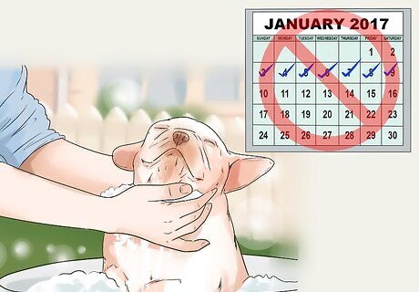 Avoid bathing your dog too frequently. Dog should be bathed regularly, but bathing too frequently will remove oils that help keep its coat and skin in good health. The recommended frequency depends on your dog’s breed and the type of shampoo you use. Dogs with oilier coats and skin folds, like Basset Hounds, should be bathed as often as once a week to prevent bacterial infections. If you use a gentle, moisturizing shampoo, you can bath your dog every week or two. For most dogs, try bathing them at least once a month or whenever they become dirty.