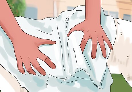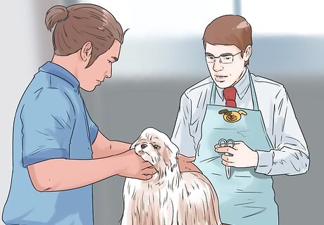 Consider using a professional groomer. Easier home makeover techniques, like brushing, can be a great bonding experience for you and your dog. However, it might be best for a professional to handle things like a super shaggy coat or nail clipping, especially if you have limited grooming experience. A professional can also handle the less than glamorous tasks, like expressing anal glands or dealing with a skunked or muddy pooch. If your dog is purebred, ask its breeder or local breed club to recommend a good groomer who’s well-versed in breed standards. Otherwise, ask your dog’s vet or dog-owning family and friends for a referral. To find the best groomer, check its website or ask for testimonials or reviews from current customers. Ask them, “Would you mind if I see your facilities in person first?” Look for clean, well-maintained facilities. Rates can vary based on your dog’s size, along with the groomer’s location and quality. Typically, expect to pay around 15 US dollars an hour, or about 40 US dollars for a mid-sized dog’s basic grooming needs.