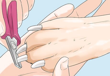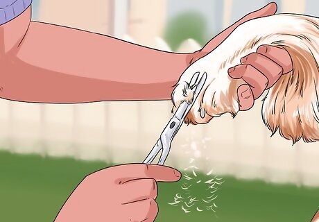 Clip your dog’s nails. Overgrown nails can interfere with a dog’s natural gait, affecting its joints and back. Use cupped dog nail clippers or a nail grinding tool to trim long nails. Avoid clipping too much off, or you’ll damage the quick, causing pain and bleeding. If your dog doesn’t like having its nails trimmed, try clipping just one or two nails per day so you don’t overwhelm it. Be sure to reward it after clipping a nail to develop positive associations.