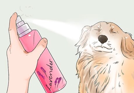 Consider using soothing scents sparingly. Studies have shown that the essential oils of lavender and chamomile calm dogs, and that those of peppermint and rosemary help increase energy. However, if you choose to use aromatherapy for your pooch, keep in mind that dogs have senses of smell thousands or tens of thousands of times more powerful than that of humans. Avoid using pure, undiluted essential oils. Try filling a spray bottle with water, and use as little as a drop of oil for the spray bottle. Even if you can’t smell the fragrance, your dog most likely will. Spray the air around your dog, but avoid spraying or applying aromatherapeutic oils directly on its skin or fur.