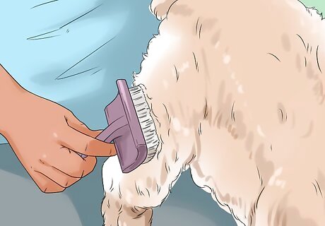 Brush out mats and debris. Use your dog’s favorite brush to comb out its coat. Make sure to clear out any plant matter or other trapped debris. If you come across a thick mat, use a finer-toothed mat pick to remove it. Try holding the matted fur from the base with your fingers as you comb it out at the edge. Holding the base of your dog’s hair as you comb mats out will help cut down on pulling, which might hurt your dog. Make sure to brush your dog’s coat before giving it a bath. Water will worsen mats and tangles.