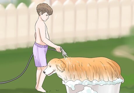 Lather and rinse your dog. Wet your dog, making sure the water is warm but not too hot to your own touch. Place a dime-sized amount of shampoo in your palm, rub your hands together, then lather it through your dog’s fur. Rinse the shampoo thoroughly, making sure no suds or residue remains. A detachable showerhead will come in handy when bathing your dog.