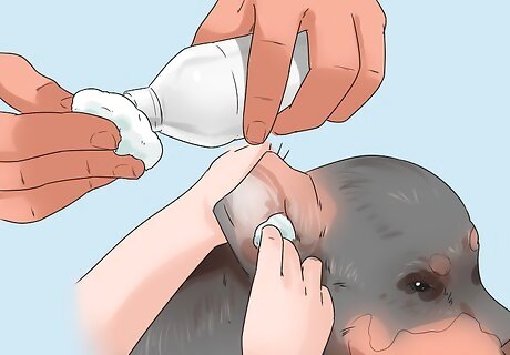 Protect your dog’s ears and eyes from getting wet. Prepare your dog’s ears and eyes before its bath using cotton balls and mineral oil. Dab two cotton balls with a drop of mineral oil and place one in each of its ears to prevent them from getting wet. In addition, put a drop of oil on your fingertips and massage around its eyes to protect them.