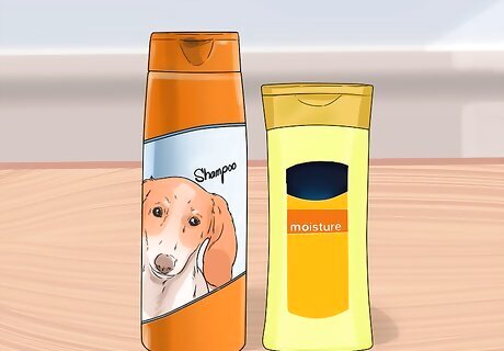 Use shampoo marked for dogs. When you bathe your dog, choose only gentle shampoos that are labelled safe for dogs. Avoid human shampoos and those marked for cats or other pets. Look for shampoos that are beneficial for any coat issues your dog exhibits. For example, if your dog has a dry, brittle coat, choose a moisturizing shampoo. If your dog’s coat is dull, choose a shampoo for shiny coats. Ask your dog’s vet if you have any concerns about nutritional or health-related causes for a dry or dull coat.