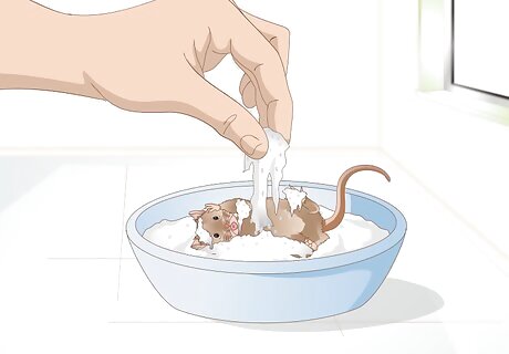 Give your gerbil a dust bath. Gerbils naturally thrive in the desert. Because their natural habitat is dry and sandy, gerbils are not used to bathing in water. Instead, they take what is known as a "dust bath," which means they roll around in sand and use it to groom the exterior coat. Use chinchilla sand for your gerbil's dust bath. You can find chinchilla sand at most pet stores, or through online retailers. Even though it is called a dust bath, it's important to give your gerbil chinchilla sand. Do not give your gerbil chinchilla dust, which is a product at many pet stores. The name may confuse you, but remember to only use sand. Do not give your gerbil sandbox sand or sand from outdoors. Store-bought chinchilla sand is the safest and most effective way to let your gerbil groom himself. Pour the chinchilla sand into a heavy crock bowl and leave it in your gerbil's cage at least once each week.