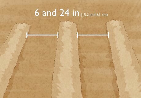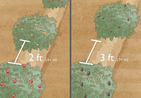 Spread out your raspberries plants. Within each row, separate red and yellow raspberry plants by a distance of 2 ft (.61 m) apart. Black raspberries will need at least 3 ft (.91 m) between each plant in a row. Be sure to keep about 6 to 24 in (15.2 to 61 cm) between rows when you are planting. Newly planted or freshly germinated plants will require about a year before they begin to fill out and can bear fruit.
