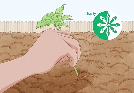 Plant the raspberries in early spring. This is the best time to plant both seedlings and grown plants. This will allow the ideal amount of time for maturation. Grown plants should bear fruit by the end of summer. For ever-bearers, expect to find fruit into fall as well. Feel free to add raspberry plants to your patch throughout the summer months. Check the weather report before planting. If there's a fear of frost or a temperature drop, you may want to keep already dormant plants in stasis by keeping them in a refrigerator. Plant these berries as soon as possible. Lay down a layer of straw over your plants to protect them from frost. Use ground cover, like a tarp or sheet, to prevent frost damage. Remove tarps or sheets in the early morning.