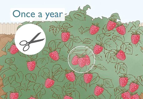 Prune your raspberries at least once per year. Training your plants by pruning them will encourage a rich and productive crop. Remove canes (stems) outside the 12 to 18 in (30.5 to 45.7 cm) total row width. Cut away any canes that are damaged, infested with insects, or appear diseased. For summer-harvest crops of red raspberries, cut down discolored, grayish canes after they have finished producing fruit. Leave new, healthy plants. For fall-harvest crops, cut off all the canes at ground level after they have finished producing fruit. For black raspberries, cut off the side fruit-producing branches after harvesting. Remove weak and untrained branches. When not producing, cut off small canes. Remove the smallest, ineffective canes from all plants in late winter. Ideally, three to six strong, healthy canes will remain after this process.