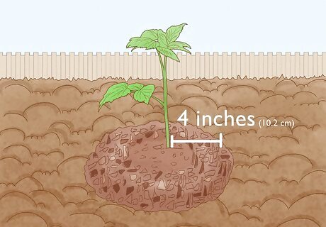 Dig a small hole for each plant and insert it into the ground. This should be just deep enough to cover the roots without touching the lowest leaves. Place the plant in the hole and cover it with soil. Cover any exposed roots but avoid burying its foliage. The depth for raspberry plant holes is usually about 3 to 4 in (7.6 cm to 10.2 cm). Use a simple hand shovel to dig the holes.