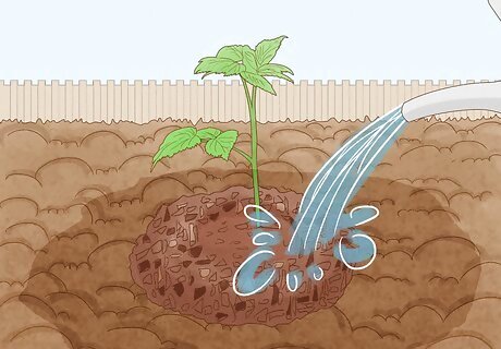 Water the area thoroughly after planting. Alternatively, soak the roots of raspberries in water for an hour or two before planting. Add a ½ tsp (2.5 ml) of a vitamin B1 growth stimulant per quart water the roots are soaking in for even better results from your planting. Heavily watering after planting can help plants to recover from the shock of transplanting. At minimum, thoroughly water you plants after planting.