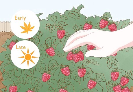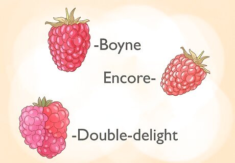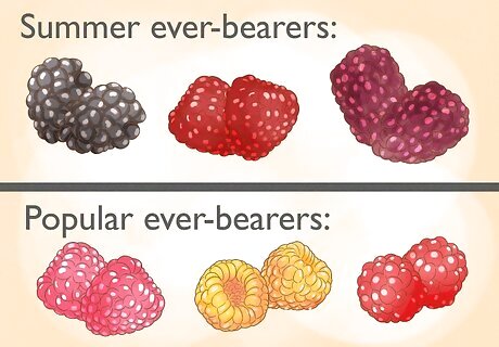 Learn about the two main varieties. Raspberries are either summer-bearers or ever-bearers. Summer-bearers only bear one crop per season during summertime. Ever-bearers, on the other hand, produce one harvest in summer and another in the fall. Popular summer-bearers: Latham (round, dark red fruit) Meeker (deep red, extremely sweet, high sugar content) Willamette (firm and slightly tart) Brandywine (large, purplish-black fruit) Black Hawk (deep black, juicy berry) Popular ever-bearers: Amity (medium-sized, dark red, firm, and fragrant) Fall Gold (golden yellow color, very sweet) September (tart, juicy, with medium sized fruit) Heritage (rich in flavor, firm, large fruit size)