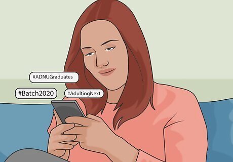 Create a special hashtag for graduates of your school to use on social media. Brainstorm a fun hashtag that you can add to your tweets and other social media posts, which highlights all of your accomplishments. Invite your friends to use this hashtag on their social media posts too. Once you’ve all posted a lot, you can click or tap on the hashtag to see a curated timeline of your posts! For instance, you can come up with something like #SmithCollegeGrads or #AdultingTimeForWashingtonGrads.