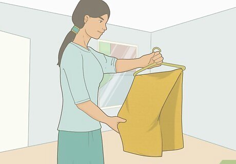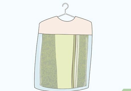 Purchase saree covers to protect them while they hang. Pick out saree covers to go over your sarees that are made out of more delicate fabrics like silk, or use them for sarees that have embellishments and need to be protected. Place your saree in a hanging saree cover, situating it inside the plastic so it's completely covered. A saree cover looks similar to any other type of wardrobe cover. You'll place your saree on the hanger in the cover and enclose the saree in the plastic or fabric before zipping it up securely. Look for a hanging saree cover online to choose from several different options.