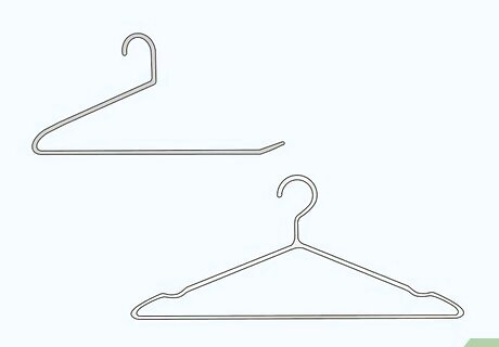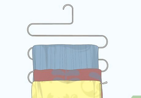 Hang sarees on trouser hangers so they take up less vertical space. While it’s totally okay to hang sarees on regular hangers, trouser hangers are perfect because their shape is shorter than a regular hanger because they're designed for pants, leaving you lots of extra space to store things at the bottom of your wardrobe. Purchase a trouser hanger for each of your sarees to hang them easily. Trouser hangers have clips attached to either end of a horizontal strip of metal or plastic. These are especially useful if your wardrobe is short.