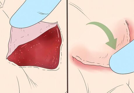 Tuck the skin flap over the skin tear, if possible. If the skin flap is still attached to the skin tear, use a damp cotton swab or your clean finger to gently ease it back into place. You can also use tweezers or a gloved finger to do this. Putting the flap back in place will help the skin tear to heal properly. Never cut off the skin flap.