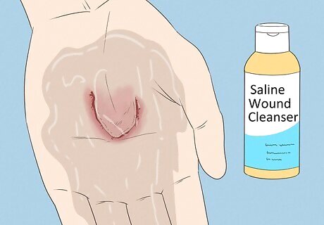 Use a saline wound cleanser as an alternative to water. You can also apply a saline wound cleanser to the skin tear. The wound cleanser will contain water and antibacterial ingredients to help clean the area. Rinse the area thoroughly with the saline, and try to wash away any obvious dirt or debris. When you apply the wound cleanser, do not rub or scrub the area. You can buy a saline wound cleanser at most drugstores.