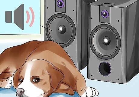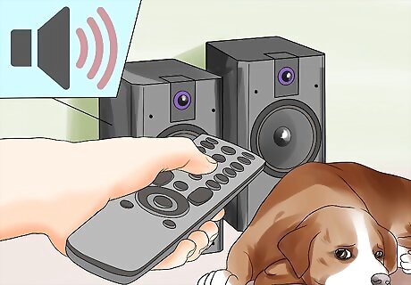 Gradually increase the volume of the feared sound. Once the dog is regularly taking no notice of the quiet background sounds, turn the volume up a tiny amount. This should be slightly louder than previously, but not enough to make the dog shows signs of anxiety, such as lip licking, pacing, whining, shivering, or shaking. Again, reward the dog with love or treats for being in the presence of the alarming noise, but not being fearful of it. Repeat this exposure until you are sure the dog is not reacting at all, and then you are ready to turn the volume up one more notch.