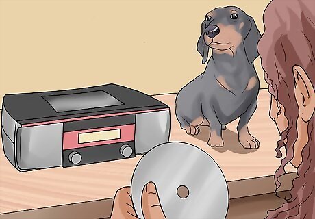 Expose the dog to a very low level of the feared sound. Train the dog to remain calm during the sound by rewarding calm behavior with a treat or affection. This is different than sensory flooding because you are using very low levels of sound and working gradually. To do this, purchase a CD of the sound the dog fears, for example fireworks or thunderstorms. The idea is to play the CD on the lowest possible volume so that the dog remains calm. Praise the dog and reward it for being calm in the presence of the sounds. If possible, leave the CD playing quietly in the background for an hour at a time but don't leave the dog alone while it is playing.
