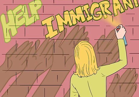 Use forms of creative expression to draw attention to the issues. If you have a passion for creativity, use your talents to teach people about what's going on in regards to immigration. You might do this using art, music, dance, theater, poetry, or any other form of creative expression. For example, you might paint a mural representing freedom for immigrants, write a song that plays on people's emotions about being separated from one's family, or read a poem you wrote about detainment centers at a poetry reading.