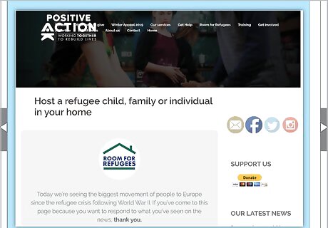 Host a refugee in your home using Room for Refugees. Room for Refugees, based in the UK, helps people seeking asylum stay in a safe home by matching them with someone willing to host someone in their house. If you’re willing to host a refugee, visit their website at http://www.paih.org/host-a-refugee/ to see if your area is participating. Room for Refugees is based primarily in the UK and Scotland. While the United States is currently setting up its Room for Refugees network, it isn't available yet.