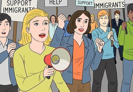 Participate in marches, protests, or other events to show your support. Joining rallies and protests is a great way to get involved in the community while taking a stand. Look to see if there are any protests or other events in support of immigrants’ rights near you so you can get involved. Find out about protests and marches near you through Facebook, Twitter, or a general online search. Plan your own civil protest or other event if there aren’t any happening in your area.