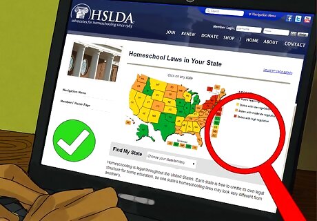 Ensure you meet all legal requirements. Before you begin homeschooling your child, you need to ensure that you are legally educating your child. Each state has different laws and regulations surrounding homeschooling. Research your state’s laws and make sure that you follow all guidelines carefully. Laws will vary between countries, states, and even school districts, so you will need to conduct preliminary research before you get started. For example, search online for “homeschool laws in Maine.” This will help you get started.