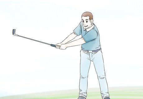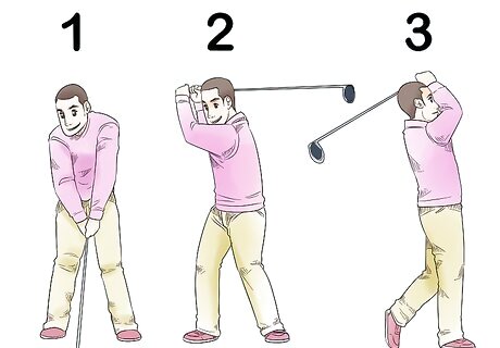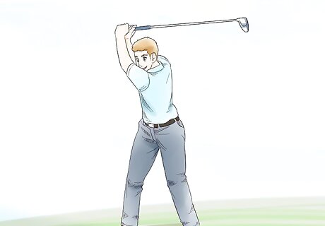 Pull your club as far back as possible. When performing your backswing, it’s important to pull your club as far away from the ball as possible, otherwise you may not gain the strength necessary to hit it properly. Additionally, an improper backswing will throw off your overall tempo, making it more difficult to connect with the ball. When done properly, your backswing should end with the club raised far above your head, held in place by barely-bent arms.