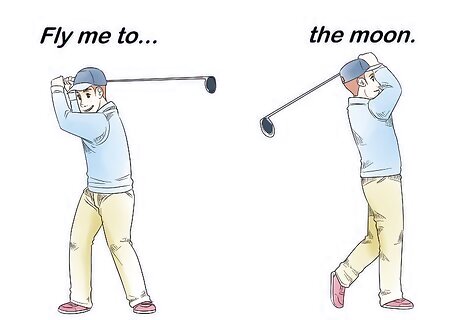Count in your head to better time your swing. Until your tempo becomes second nature, keeping a mental timer can help you make your shots more consistent while ensuring they’re done at a proper speed. Though you can choose any pattern you want, the 1-2-3 count used for waltzing meshes well with golf tempo, the first 2 beats lining up with the backswing and the third beat lining up with the downswing. In addition, you can try and time out your swings using songs like: Edelweiss from Fiddler on the Roof, where the backswing lines up with “E-del” and the downswing lands on “weiss.” Fly Me To The Moon by Frank Sinatra, where the backswing lines up with “Fly me to” and the downswing lands on “the moon.” Fallin’ by Alicia Keys, where the backswing lines up with “I keep on” and the downswing lands on “fallin’.”