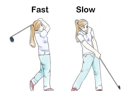 Aim for a downswing that is 3 times faster than your backswing. From Tiger Woods to Arnold Palmer, just about every golf master has a 3:1 swing tempo, meaning their backswing takes 3 times longer to complete than their downswing. While practicing, ask a friend to time both portions of your swing to see how you stack up. If your downswing is too fast, try slowing down your takeaway to change the pace of the shot. If your downswing is too slow, make sure your posture is correct and not causing unnecessary drag.