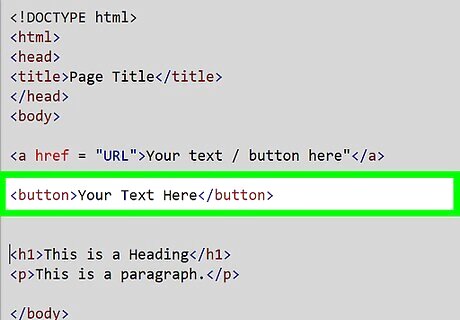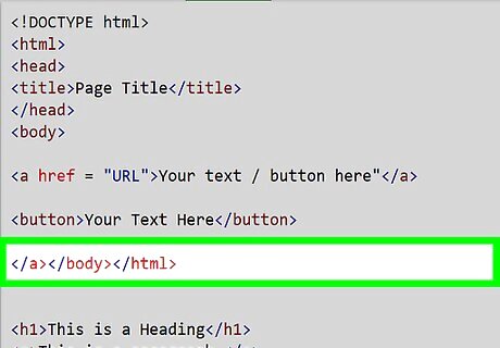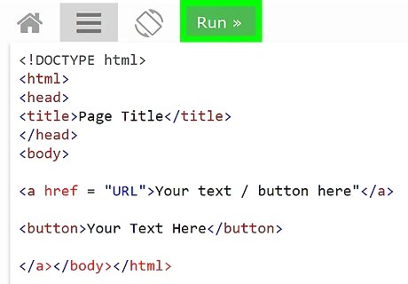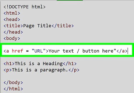 Add tag under the tag. tag is used to insert hyperlinks. Under the tag and add your desired URL, say "https://www.wikihow.com/". The syntax of tag is: Your text / button here"