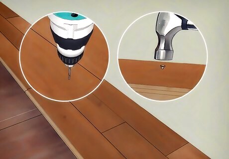 Nail the boards to the subfloor. Use the drill to make guide holes and then, using a hammer, nail the board into the subfloor with nails placed 1-3” from the end of the plank, ½” from the groove side, and every six inches down the board. Use a nail set to finish.