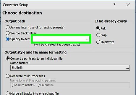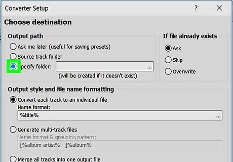 Select Specify folder in the "Output path" section. This section is in the upper-left corner of the Destination menu. When this option is selected, you can select a folder to save your merged FLAC file. This step is completely optional. If you skip it, you'll be prompted to select a saving location when you start the conversion process.