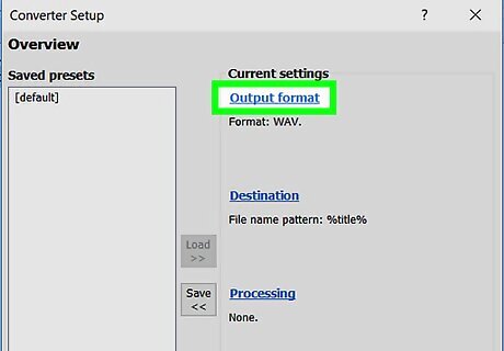 Click the Output format option in the Converter Setup window. This option is written in blue letters under the "Current settings" heading at the top. It will open a list of all the available formats. You can see your current conversion format below Output format here .