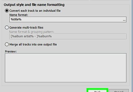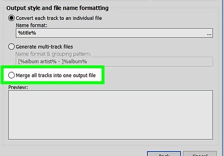 Select Merge all tracks into one output file at the bottom. You can find this option in the "Output style and file name formatting" section above the Preview box at the bottom of the Destination menu. When this option is selected, your audio files will be automatically joined together, and merged into a single FLAC file.