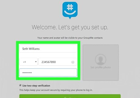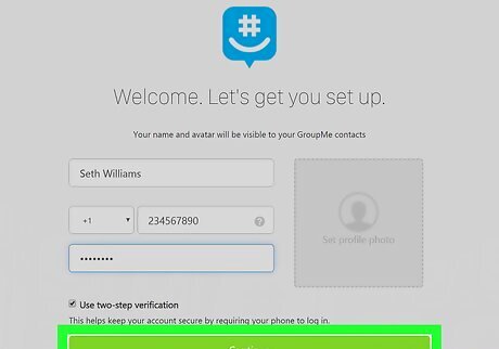 Check your SMS messages. You should receive a code to enter on the GroupMe website. Enter the code and click Start chatting!. Keep in mind that the code may take a few minutes to reach you depending on your connection and/or server load. Save your backup key in a safe place. If you lose access to your phone and forget your password it will be the only way to get into your account.