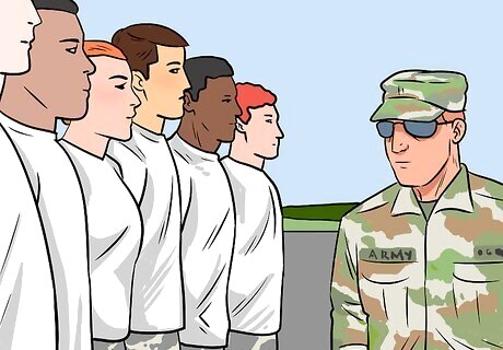 Attend Army boot camp for 10 weeks if you joined the Army National Guard. After your acceptance into the Army National Guard, you will have to participate in a 10-week boot camp. Once the boot camp is over, you will also have to attend training for 1 weekend of every month. After an introductory week (known as Zero Week), the first 3 weeks are known as the Red Phase. These focus on teamwork activities. The next 3 weeks are known as the White Phase, which focus on more physically intense training. The last 3 weeks are known as the Blue Phase, and you'll spend time on practice exercises and meeting graduation requirements. In order to graduate, you need to pass a fitness test and be able to demonstrate your skills with certain weapons and exercises.
