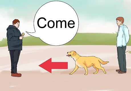Teach your dog to come when you call. Getting your dog to run back to you can save its life in an emergency. To train your dog, try getting a second person to restrain it as you call its name and offer a treat or toy. When the second person releases your dog, use the call “come.” Your dog will learn to associate the word “come” with running back to you. It is easiest for your dog to pick up these commands when it is a puppy, but commands should be reinforced regularly throughout its life. Practice using this and other commands on nearly a daily basis. Never use the call “come” when you intend to scold your dog. If your dog associates the command with negative memories, it is less likely to respond to it. In general, positive reinforcement is more effective and humane than scolding your dog.