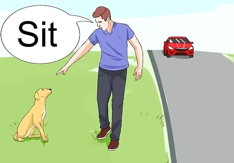 Teach your dog to sit by the road. With your dog on a leash, give it a command like “sit” as a car approaches. If it sits appropriately as the car passes, make a noise with your clicker and give it a treat. You will probably need to start far away from the road to limit the attraction of the cars. If your dog is having trouble, try a command that might better get your dog’s attention. Teach your dog “find it” and then drop treats in front of it. Your dog will hopefully be too busy finding and eating treats to give much thought to cars.