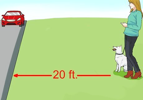 Practice your trip closer to the road each time. Your dog will be less excitable if it is standing instead of walking. It will also be less excitable further away from the road. So, start off stationary, 15 or 20 feet from the road. If your dog performs the trick without getting distracted, try it the next day a couple of feet closer to the road. Don’t expect your dog to learn this trick immediately. Try four or five sessions, fifteen minutes long. Every time your dog is rewarded for correctly following its command, it will develop a stronger positive association with staying away from the road.