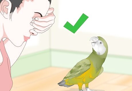 Play games with your bird. When it comes to entertaining your bird, nothing compares with focused interaction. Play classic games or make up your own. Set aside some time to play with your bird every day. Some games include: Peek-a-boo. Chase. Fetch or catch (with a ball). Call and response (speaking games).