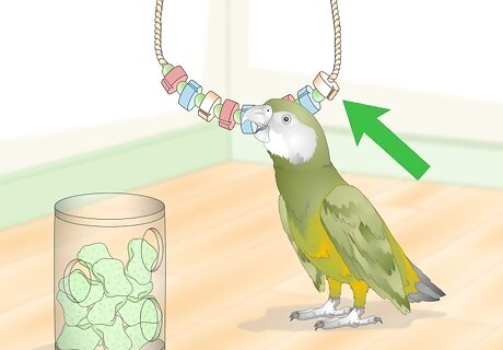 Provide lots of toys. Stocking your bird’s cage with a variety of toys helps to keep them busy and entertained. Senegals especially love to bite and chew, so include some toys made of soft wood (that they can destroy). Chewable toys such as wooden blocks, leather, paper, and cotton rope will give your parrot something to chew while keeping their beak strong. Swings help keep parrots active. The parrot can exercise and play on the swing. Foraging toys are toys with treats hidden inside. These toys can occupy parrots for hours and keep them mentally active and stimulated. Toys that make sounds, like bells and keys, will give your parrot something to make noise with. Puzzles and ladders provide a challenge for your parrot, which can keep the bird engaged for long periods of time.