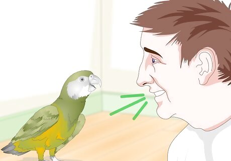 Talk with your bird as often as possible. Birds are best socialized if they are treated like members of the family. Rather than only interacting with your bird during scheduled play times, be sure to talk with your bird as much as you can. Greet them whenever you walk into the room. Read books out loud to them.