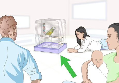 Place the cage in a central location. Your parrot wants to be part of the family. As such, they will be most happy if their cage is centralized within the home. Place your Senegal's cage in the living room, den, or other space (excluding the kitchen) where people frequently hang out. The kitchen is not a good option, because parrots are sensitive to smells.