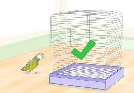 Make sure the cage is large enough. Your Senegal parrot needs a nice large space to move around in, play, and relax. Your cage should be no smaller than 20 inches (50.8 cm) long by 20 inches (50.8 cm) deep by 28 inches (71.12 cm) high (for one parrot), but bigger is always better. Look for a cage with ¾ inch (1.9 cm) bar spacing. Look for a cage with horizontal bars (at least on 2 sides) for your parrot to climb.